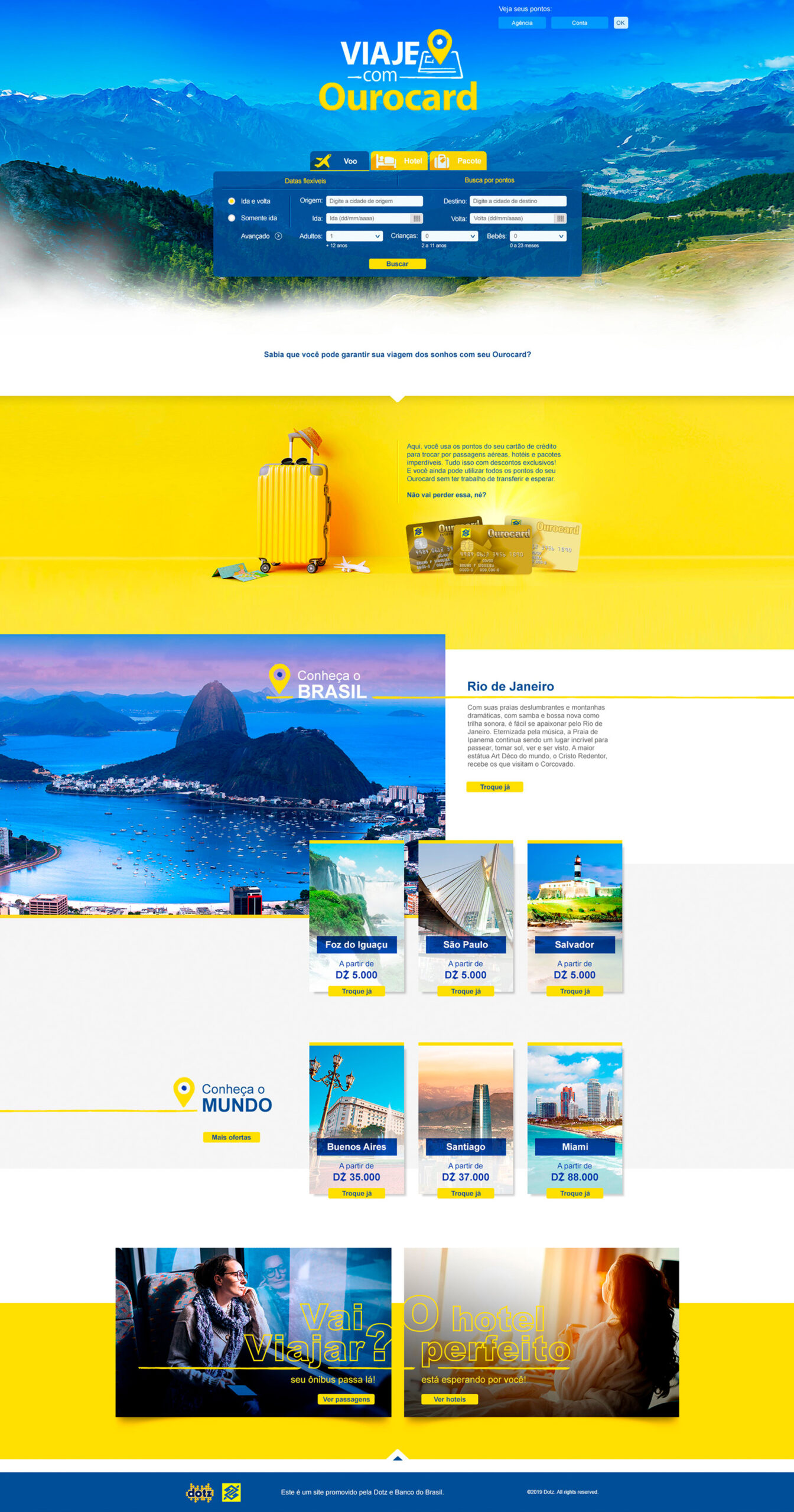 Design de página desenvolvido para a campanha Viaje com Ourocard, uma parceria entre o Banco do Brasil e a Dotz, com foco em engajamento e divulgação dos benefícios de viagem por meio da conversão de pontos. O projeto prioriza clareza na comunicação, hierarquia visual e uma navegação intuitiva, conduzindo o usuário pelas informações principais de forma fluida. A composição visual equilibra apelo estético e estratégia, fortalecendo a percepção de marca e apoiando os objetivos de conversão e fidelização.